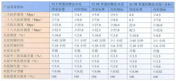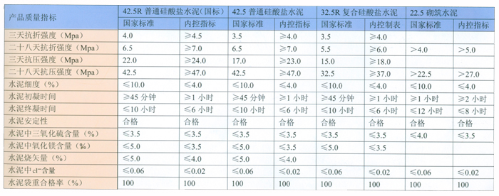 閩福牌水泥通過(guò)了ISO9001質(zhì)量管理體系認(rèn)證。高于國(guó)家標(biāo)準(zhǔn)的內(nèi)控指標(biāo),主導(dǎo)產(chǎn)品有:P•O52.5(低堿)、P•O42.5(低堿)和P•C32.5R復(fù)合硅酸鹽水泥。